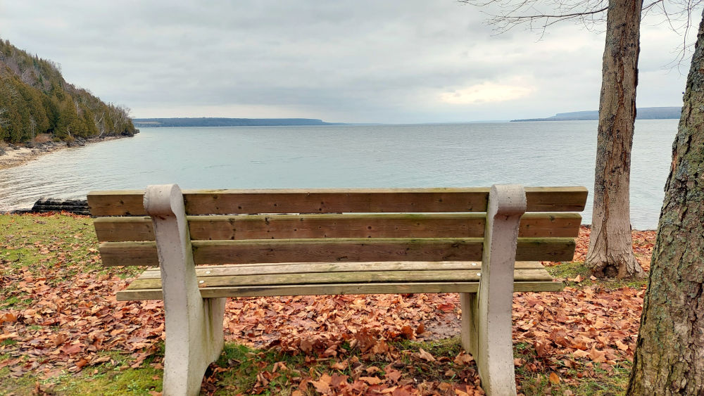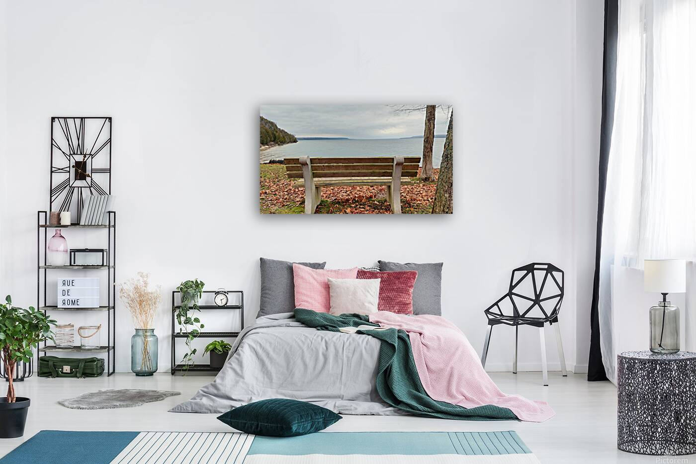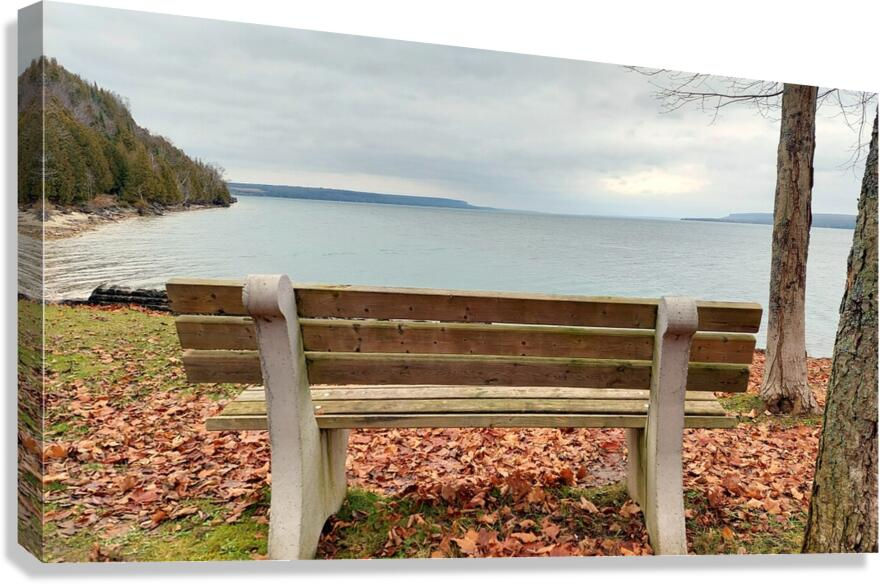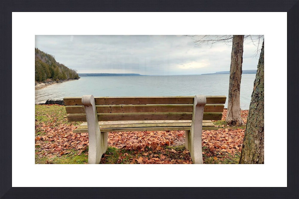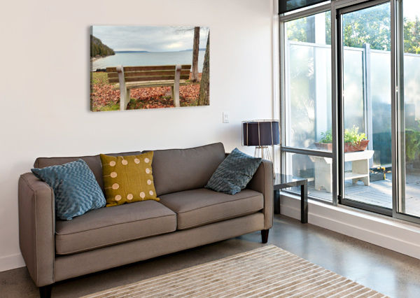 The perfect blend of peace and natural beauty with this Autumn landscape photo, capturing an idyllic lakeside scene. Imagine yourself sitting on this charming wooden bench, embraced by the crisp autumn air and the gentle rustle of fallen leaves. The expansive, calm waters stretch out before you, meeting the horizon in a serene dance of blues and grays. Flanked by tall, stoic trees, this secluded spot offers a sanctuary from the hustle and bustle of daily life.