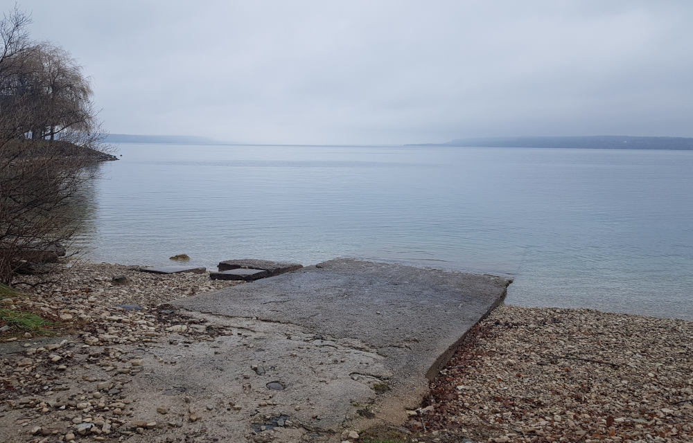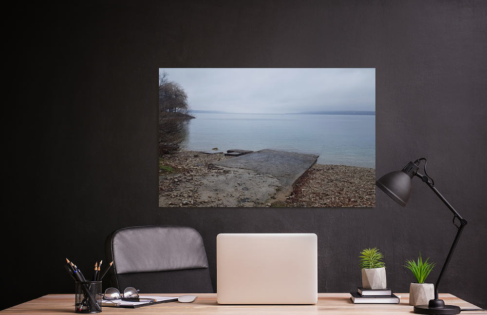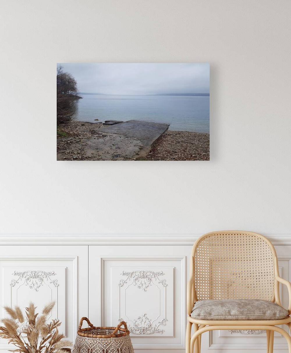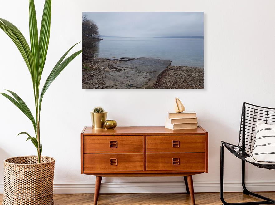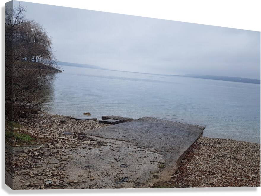This image captures a quiet, misty day on the shore, where a ramp leads gently into the calm, glassy waters. The soft, muted tones of the overcast sky blend seamlessly with the tranquil bay, creating an atmosphere of peaceful solitude.