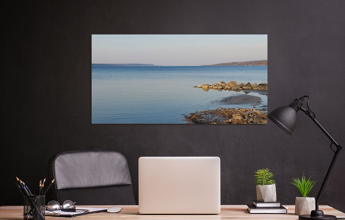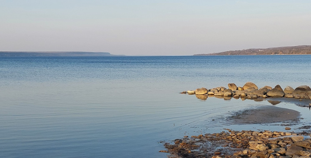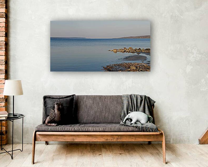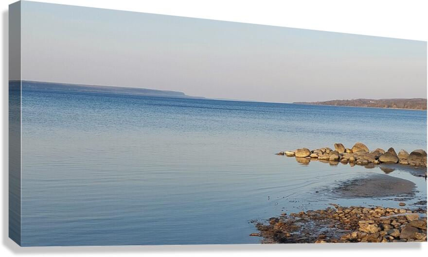 This image showcases the calm, crystal-clear waters gently lapping against the rocky shoreline, creating a soothing and peaceful scene. The distant horizon meets the soft blue sky, inviting you to lose yourself in the expansive view. Perfect for those who appreciate the serene and unspoiled beauty of nature, this photograph offers a glimpse into the untouched charm of White Cloud Island.